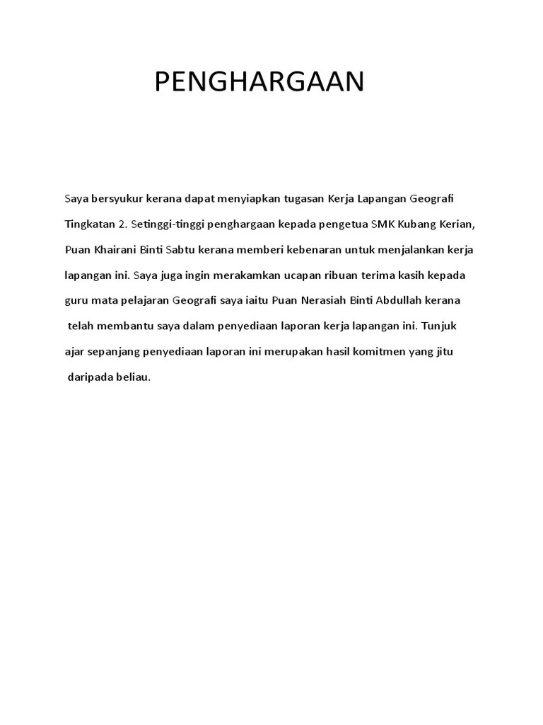 Penghargaan Kerja Lapangan Geografi / Kerja Kursus Geo 2013 Don T Copy. Apa yang perlu anda lakukan di bahagian ini ialah : Selain itu, kepada guru mata pelajaran geografi saya . Contoh objektif kajian kerja lapangan tugasan geografi tingkatan 3 bumi gemilang. Contoh rumusan folio geografi tingkatan 2 contoh buku. Kerana beliau telah memberi kebenaran kepada saya untuk menjalankan kerja kursus ini. Contoh objektif kajian kerja lapangan tugasan geografi …. Senarai kandungan muka surat isi kandungan 5 1.0 penghargaan 6 2.0 pendahuluan 7 3.0 objektif kajian 8 4.0 . Kelas geografi online membincangkan penulisan kerja lapangan geografi.tingkatan 2.
